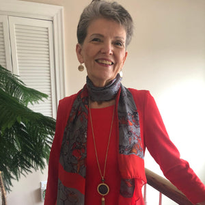 Wearing this art silk scarf is the perfect way to dress up any of my outfits and add a bit of colour, happiness and elegance to my look, no matter the season. I am so pleased with it! (Noelle D.)